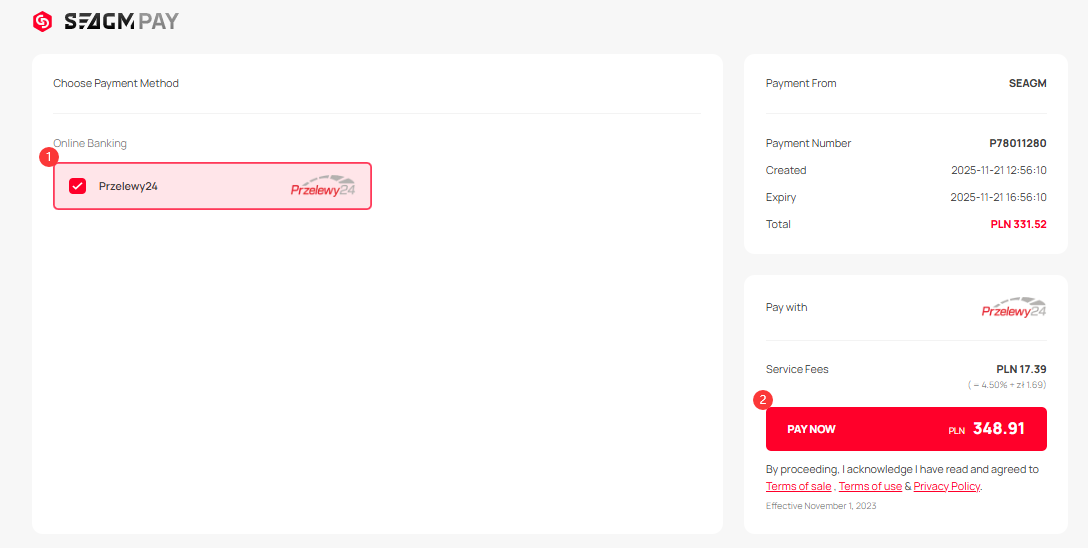 1. Przelewy24 payment method is ONLY available for Poland users under Polish złoty [PLN] in SEAGM.