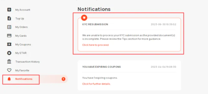 [i] For verification that does not meet our requirements, you will receive a notification on "KYC Resubmission":
