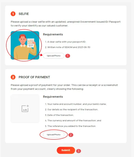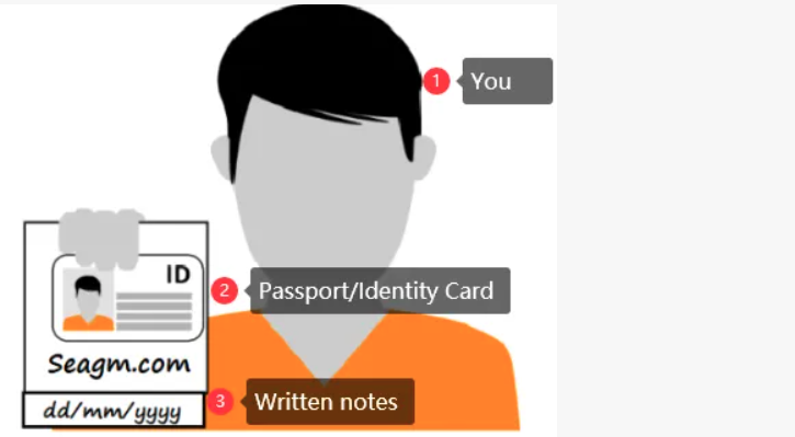 - Take a selfie by holding a passport/identity card with a written note of【SEAGM+DATE】, example as follows below:
