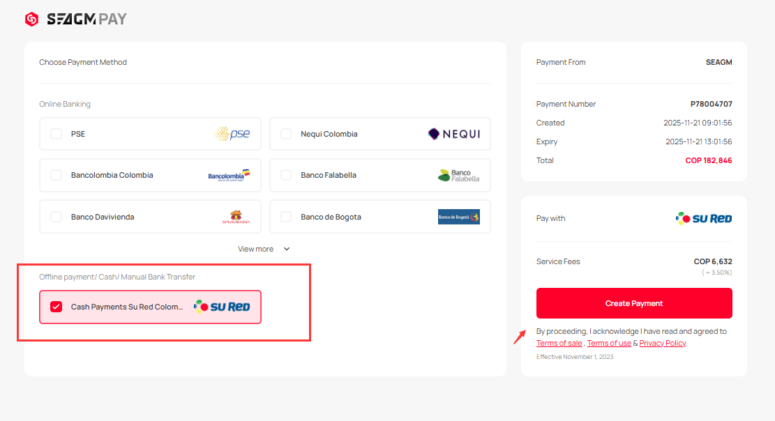 Step 2: On the payment page, select your preferred 'Offline payment' under Cash. Then click on 'Create Payment".