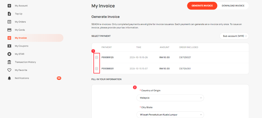 Step 3: You will be directed to the SEAGM My Invoice page. Kindly select which payment order you would like to generate the e-invoice, and then fill in your information.
