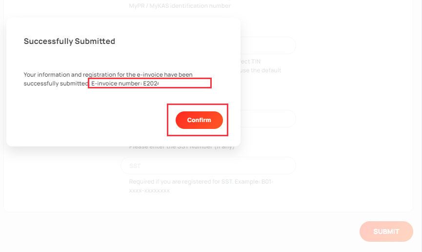 Step 5: Once clicked on [submit] is clicked, a confirmation of submission will pop up. You will be given the E-invoice number for your reference; you may screenshot it for reference if needed.