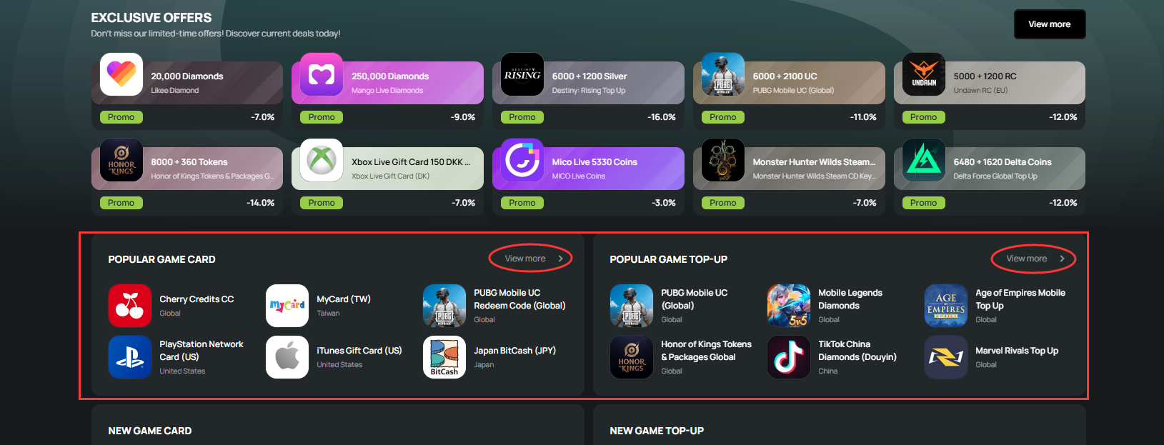 Step 3: Click “View More” in that section to browse all the popular games and top-ups.