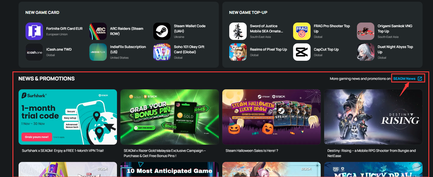Step 3: Click “More gaming news and promotions on SEAGM News” to be directed to the SEAGM News page, where you can find all the latest events, deals, and updates.