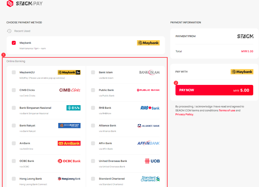 Step 3: At the SEAGM Pay page, choose online banking and select the desired bank/payment channel, then click "Pay Now."