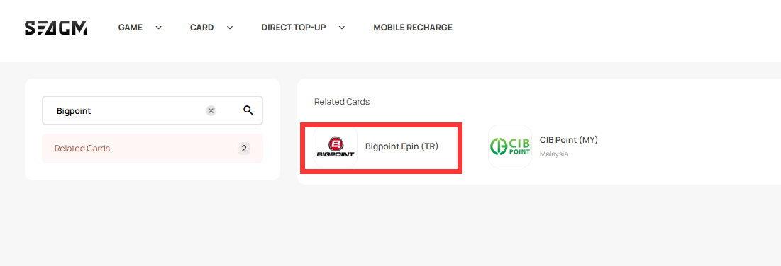 Step 1: Log in or register for an account in SEAGM. On the top menu, enter the keywords "Bigpoint" and search. Select "Bigpoint Epin (TR)".