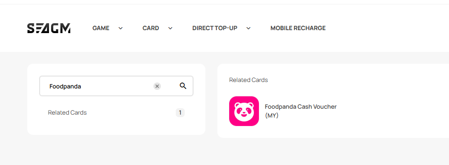 Step 1: Log in or register for an account in SEAGM. On the top menu, enter the keywords "Foodpanda" and search. Select "Foodpanda Cash Vouchers (MY)".
