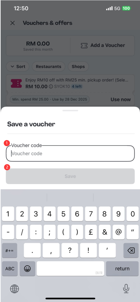 Step 5: Navigate to the “Add a Voucher” tab. Here, copy and paste the Foodpanda gift card code you received from SEAGM into the input field, then tap “Save”.