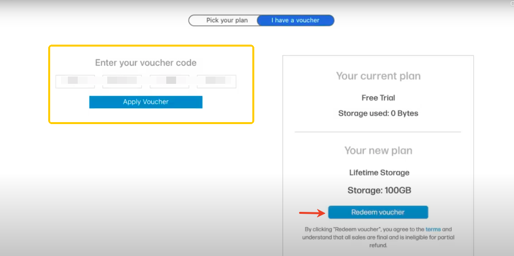 Step 4: After clicking ‘Upgrade,’ choose ‘I have a voucher,’ enter your 16-digit code carefully, and click ‘Apply Voucher’, then, select ‘Buy Now’ and your account will be upgraded to the purchased cloud storage capacity immediately upon completion.