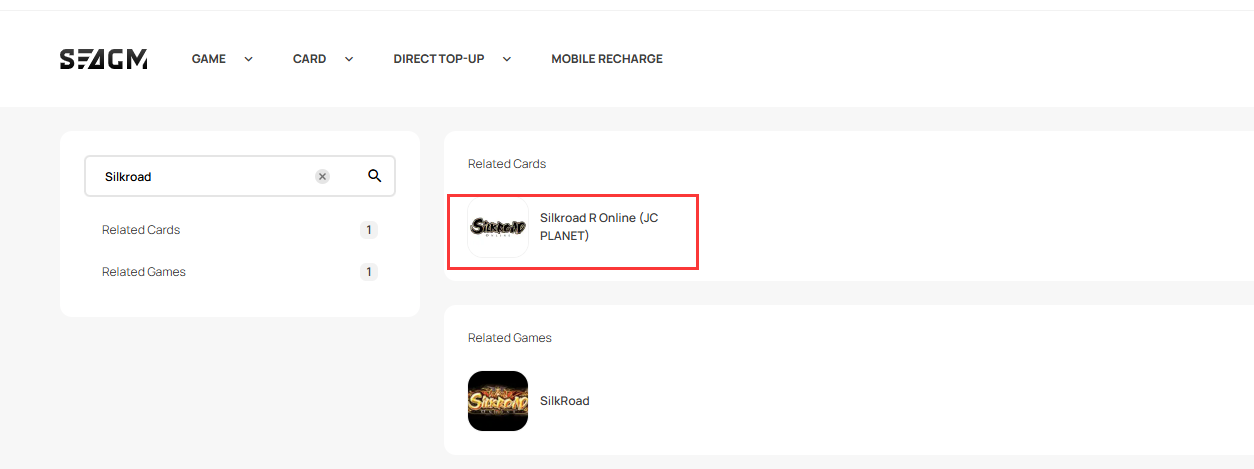 Step 1: Log in or register for an account in SEAGM. On the top menu, enter the keywords "Silkroad" and search. Select "Silkroad R Online [JC PLANET]".