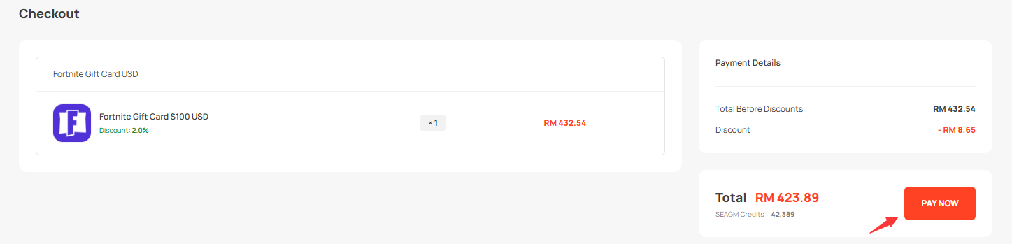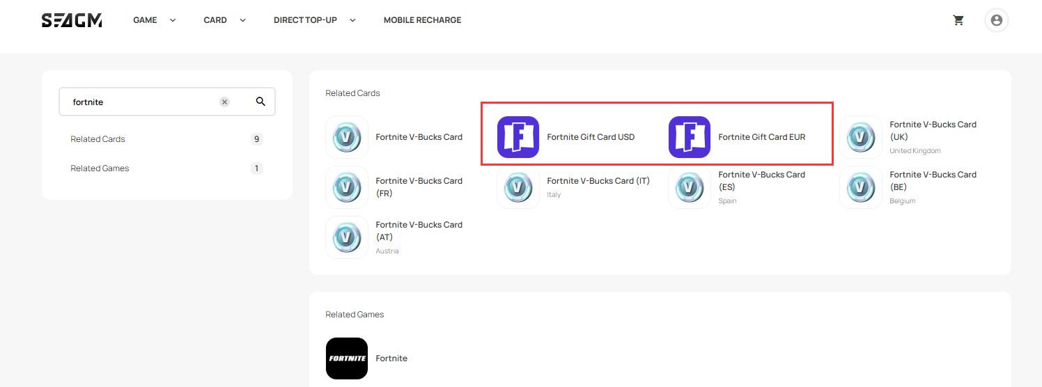 Step 1: Log in or register for an account in SEAGM. On the top menu, enter the keywords "Fortnite" and search. Select "Fortnite Gift Card [region that you need]".