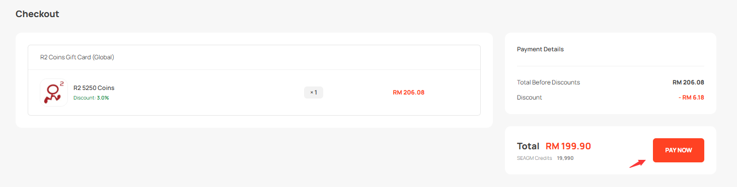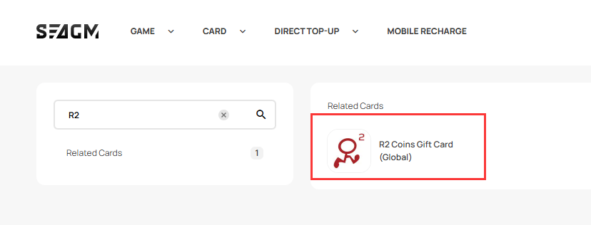 Step 1: Log in or register for an account in SEAGM. On the top menu, enter the keywords "R2" and search. Select "R2 Coins Gift Card [Global]".
