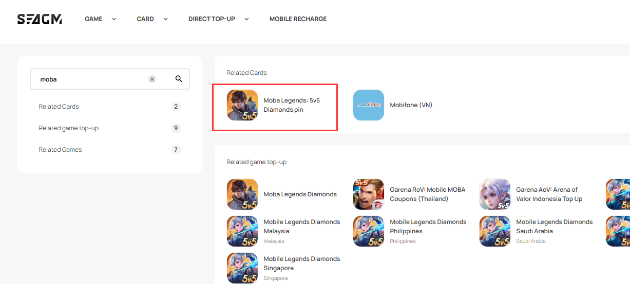 Step 1: Log in or register for an account in SEAGM. On the top menu, enter the keywords "Moba" and search. Select "Moba Legends: 5v5 Diamonds pin".