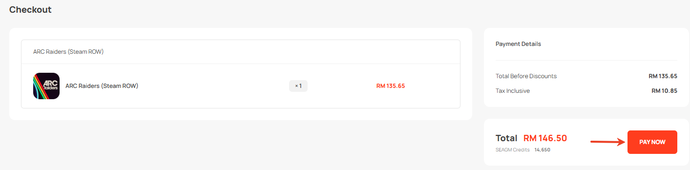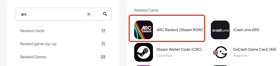Step 1: Log in/register an account in SEAGM. On the top menu, enter the keywords "Arc" and search. Select "ARC Raiders (Steam ROW)".