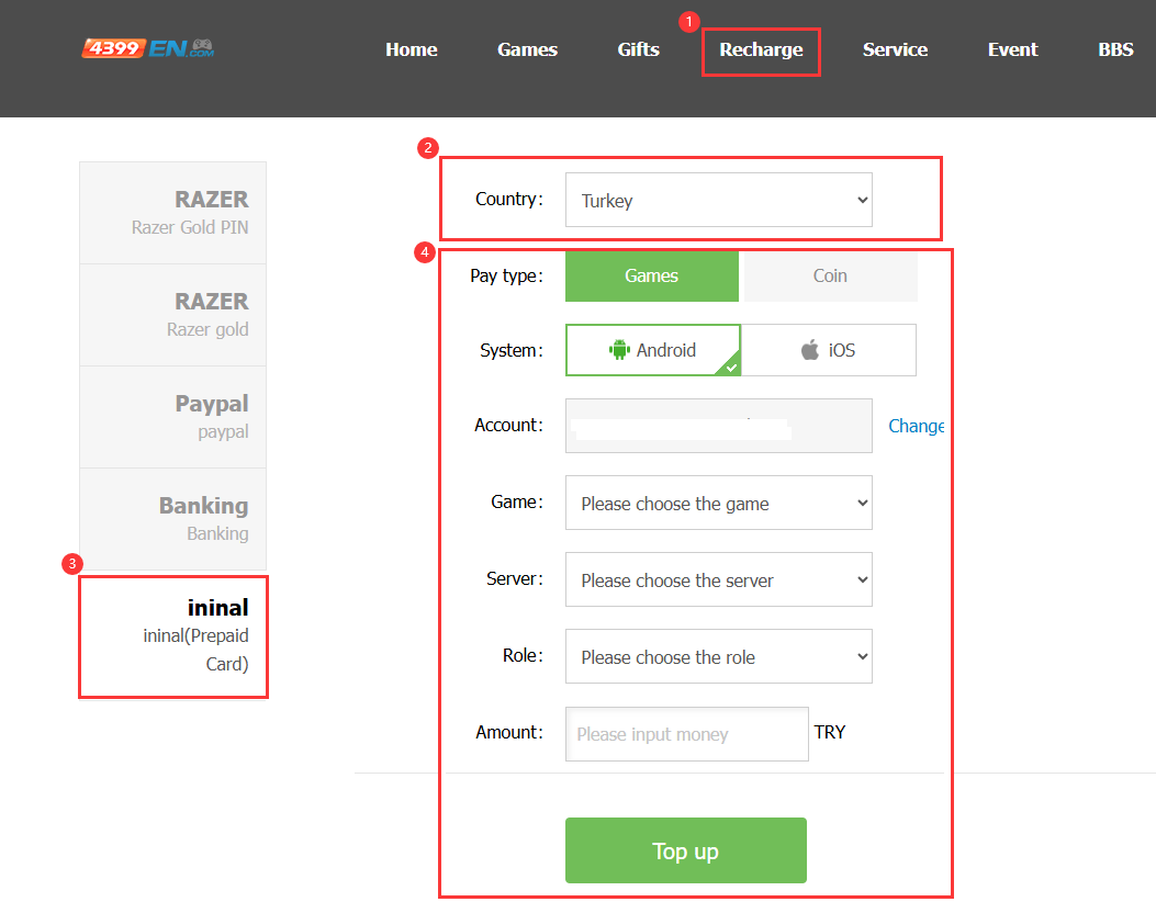 Step 3: After logging in, click [Recharge], select [Turkey], and choose the Ininal Prepaid Card payment method.