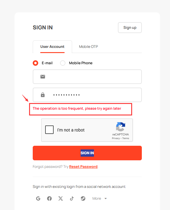 Sometimes, when actions are performed too quickly or repeatedly on the site, you may see the message: “The operation is too frequent, please try again later.”