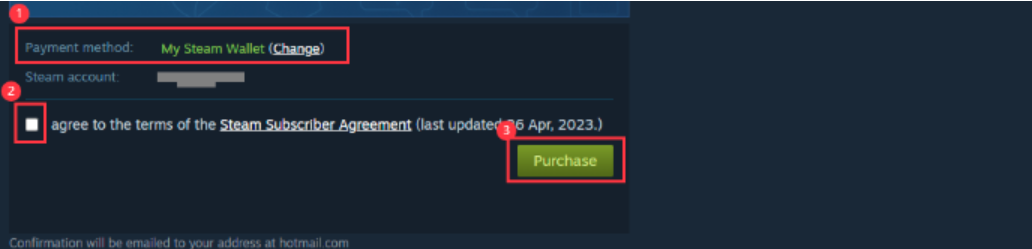 Step 10: Confirm payment method as wallet, tick the agreement box and click [purchase].