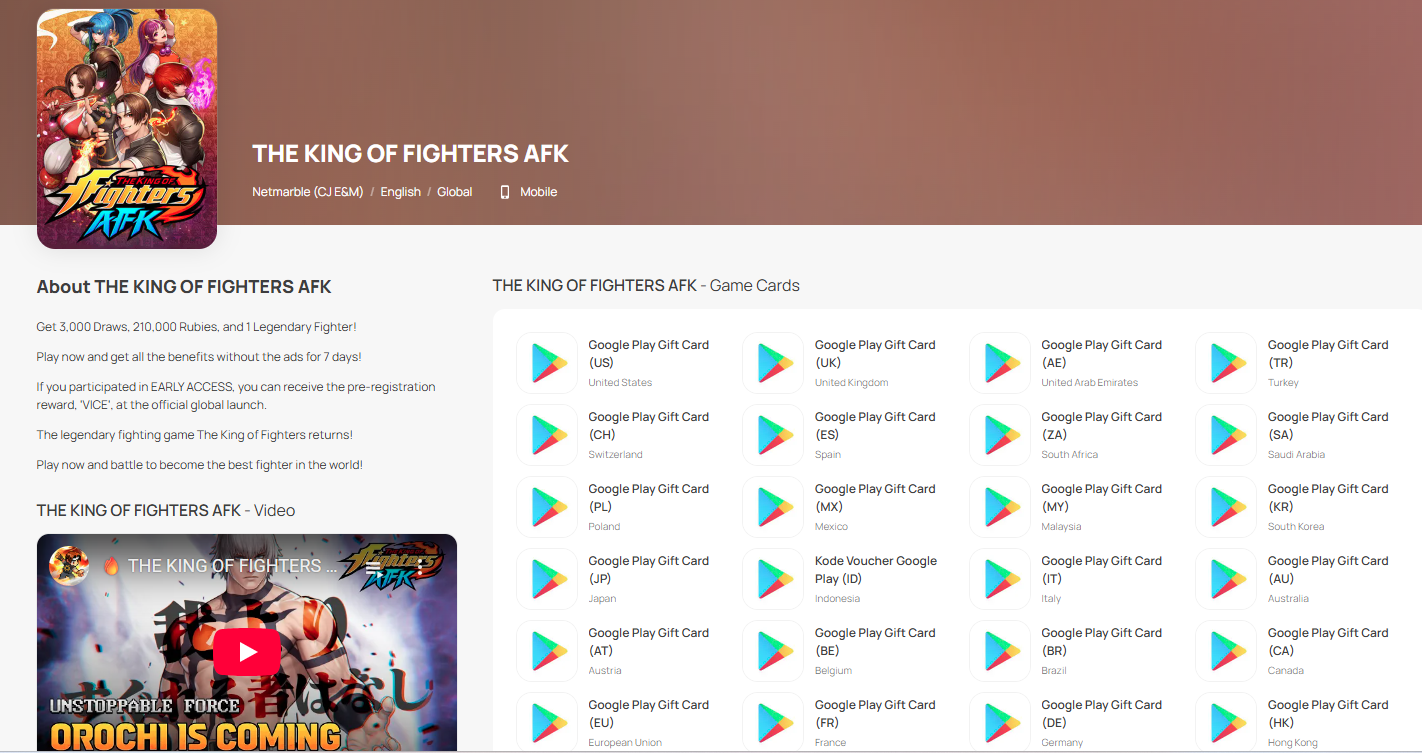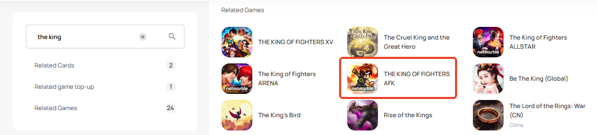 Step 1: Log in/register an account in SEAGM. On the top menu, enter the keywords "The King" and search. Select "THE KING OF FIGHTERS AFK".