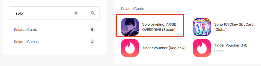 Step 1: Login or register an account in SEAGM. On the top menu, enter the keywords "Solo" and search. Select "Solo Leveling: ARISE OVERDRIVE (Steam)".