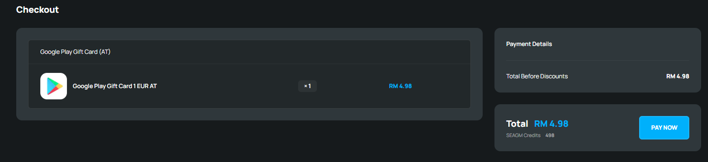 - The Google Play Gift Card sold in SEAGM was a region-currency-locked card. Please ensure the purchase gift card region is the same as your registered Google account.