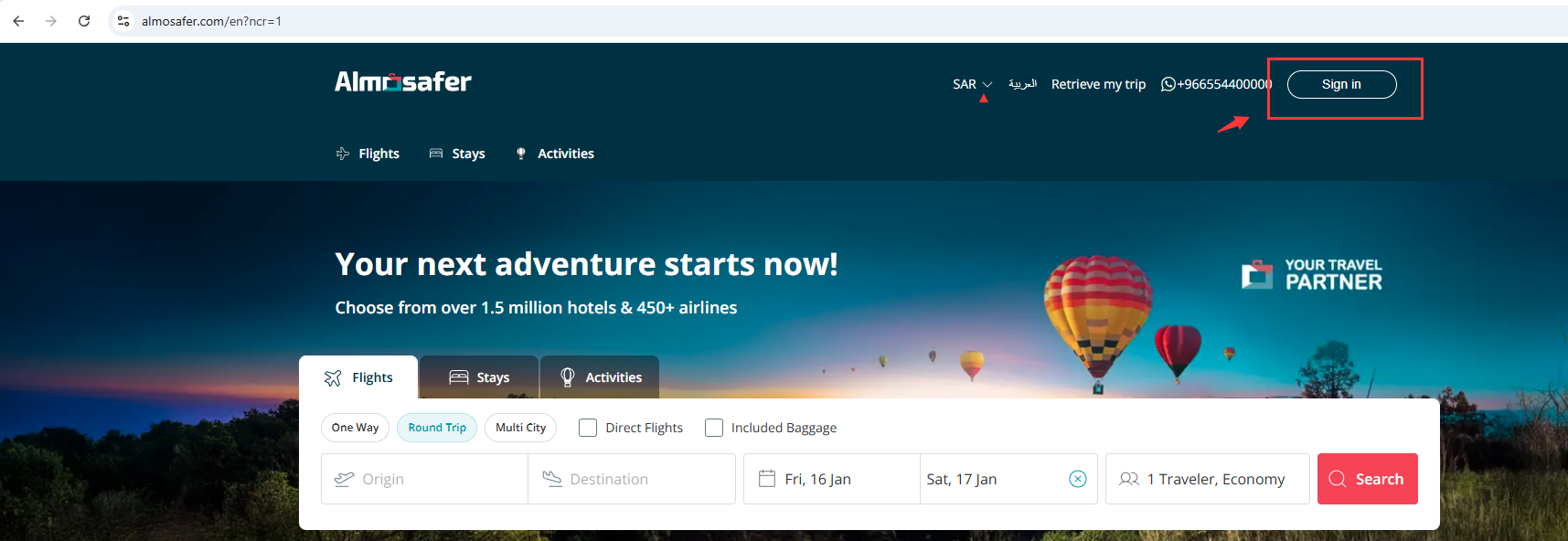 Step 2: Visit the Almosafer website, and proceed with login or registration.