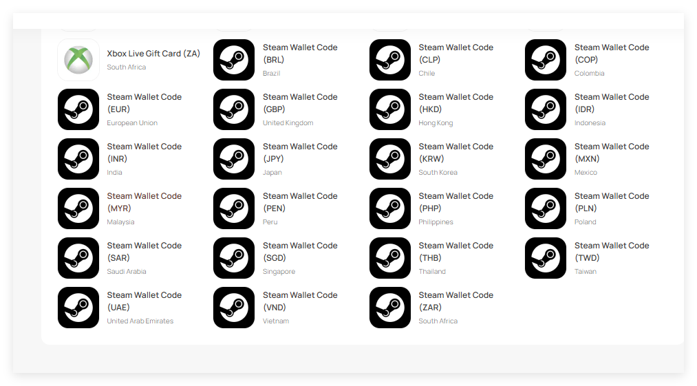 Step 2: Scroll down the page and select the Steam Wallet Code gift card based on the currency of your account region.