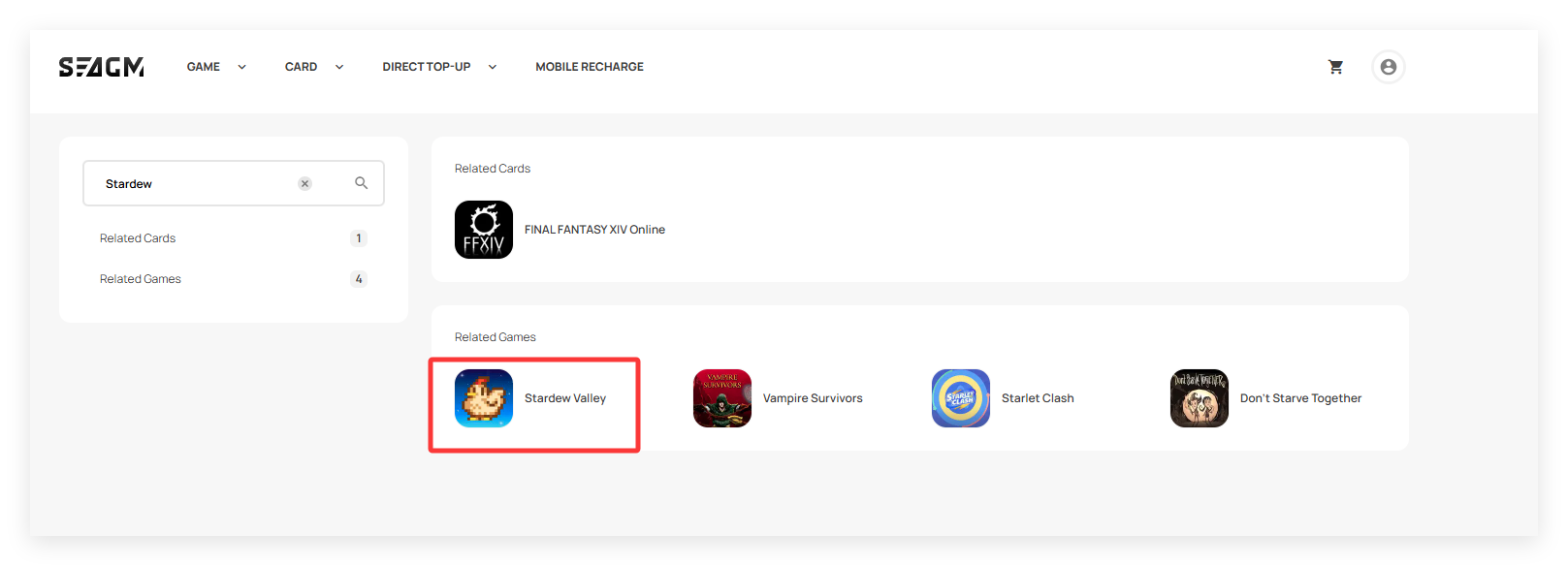 Step 1: Log in/register an account in SEAGM. On the top menu, enter the keywords "Stardew" and search. Select "Stardew Valley".