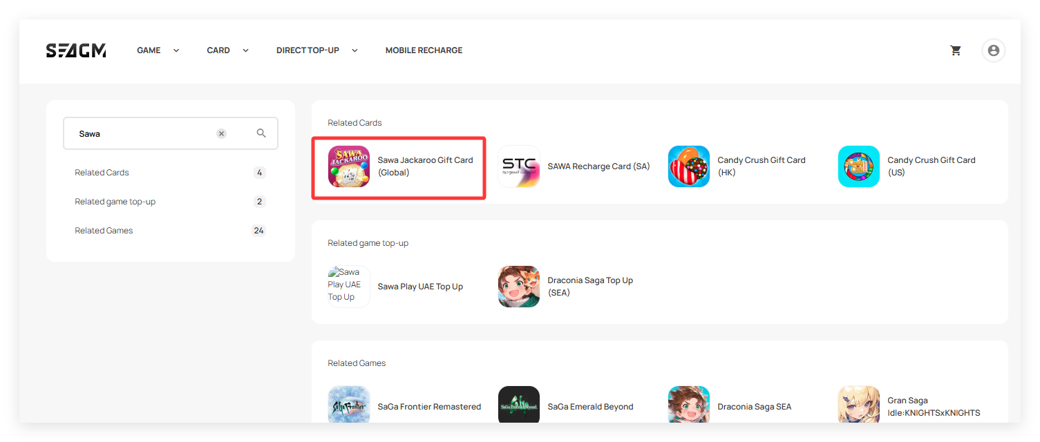 Step 1: Log in or register for an account in SEAGM. On the top menu, enter the keywords "Sawa" and search. Select "Sawa Jackaroo Gift Card [Global]".