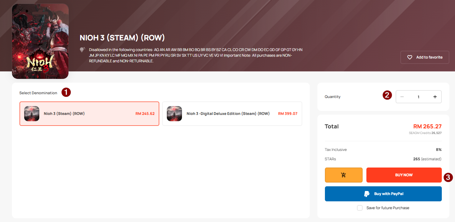 Step 1: Log in/register an account in SEAGM. On the top menu, enter the keywords "Nioh" and search. Select "Nioh 3 (Steam) (ROW)".