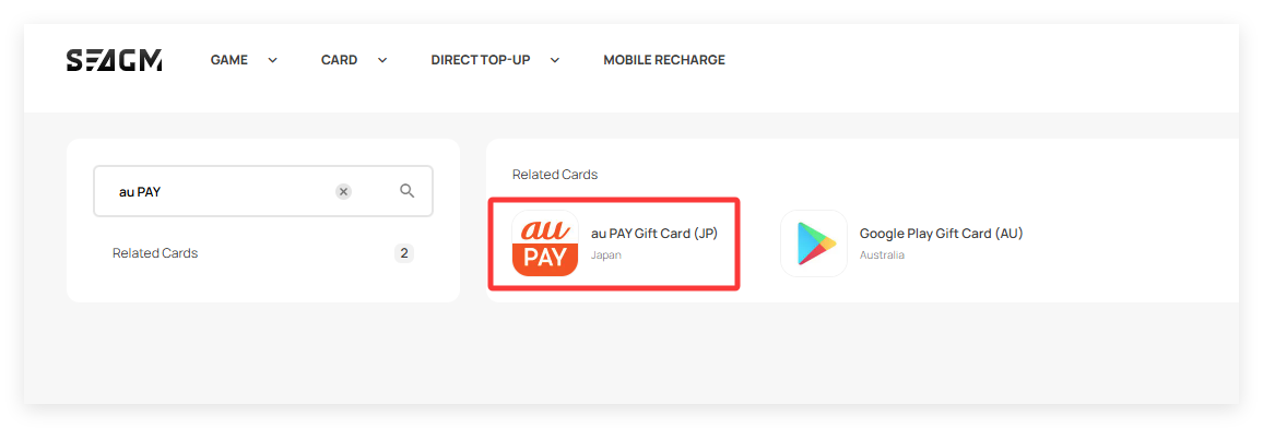 Step 1: Log in or register for an account in SEAGM. On the top menu, enter the keywords "au PAY" and search. Select "au PAY Gift Card [JP]".