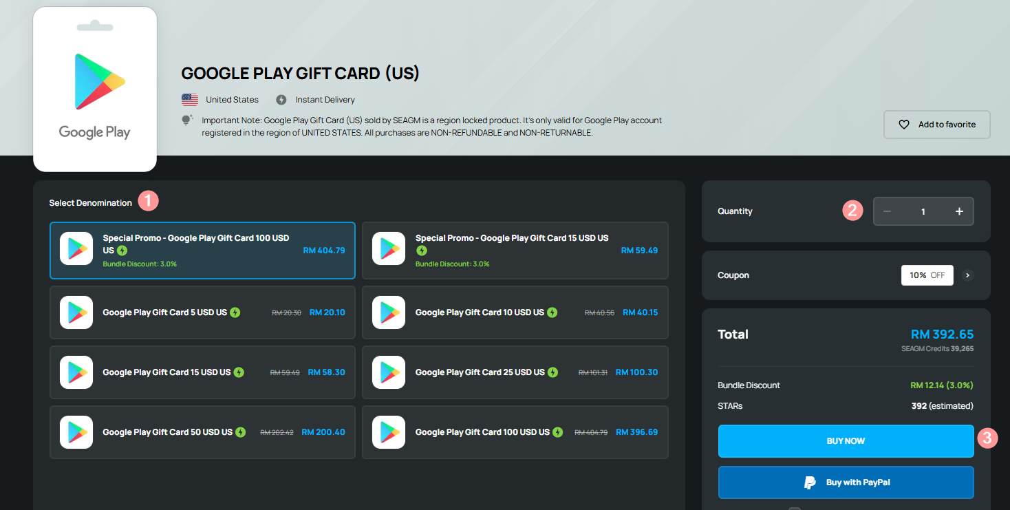 - The Google Play Gift Card sold in SEAGM was a region-currency-locked card. Please ensure the purchase gift card region is the same as your registered Google account.