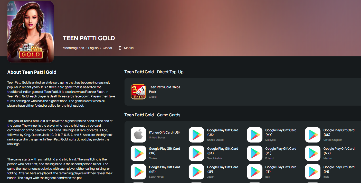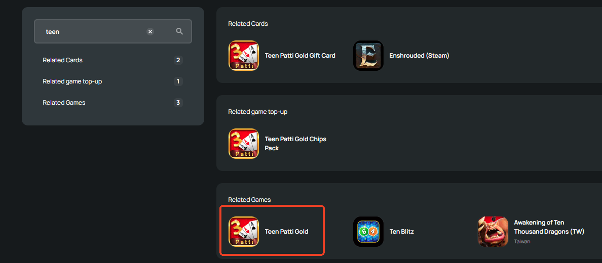 Step 1: Log in/register an account in SEAGM. On the top menu, enter the keywords "Teen" and search. Select "Teen Patti Gold".