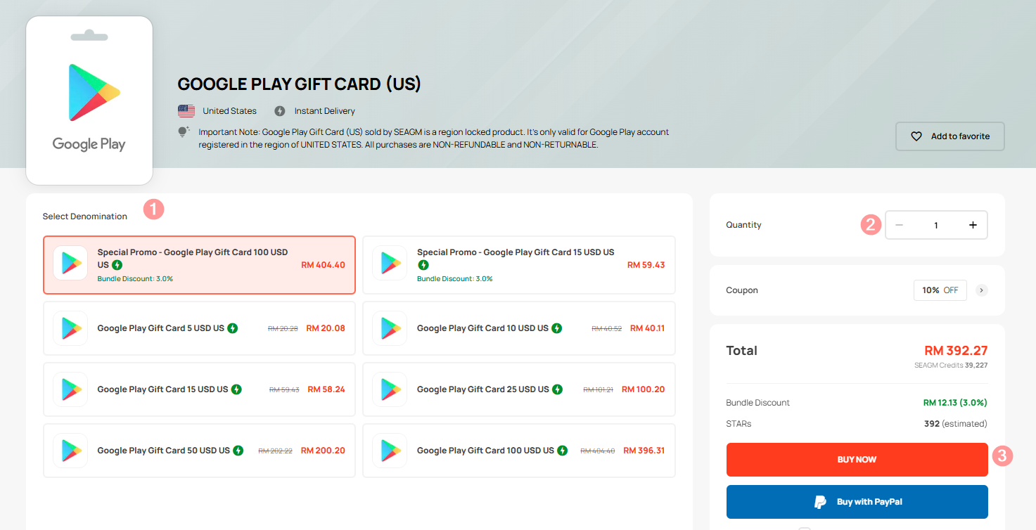 - The Google Play Gift Card sold in SEAGM was a region-currency-locked card. Please ensure the purchase gift card region is the same as your registered Google account.