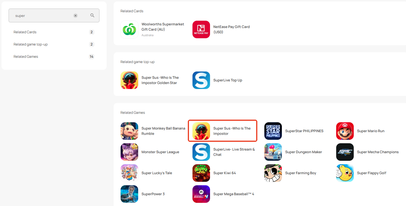 Step 1: Log in/register an account in SEAGM. On the top menu, enter the keywords "Super" and search. Select "Super Sus -Who Is The Impostor Golden Star".