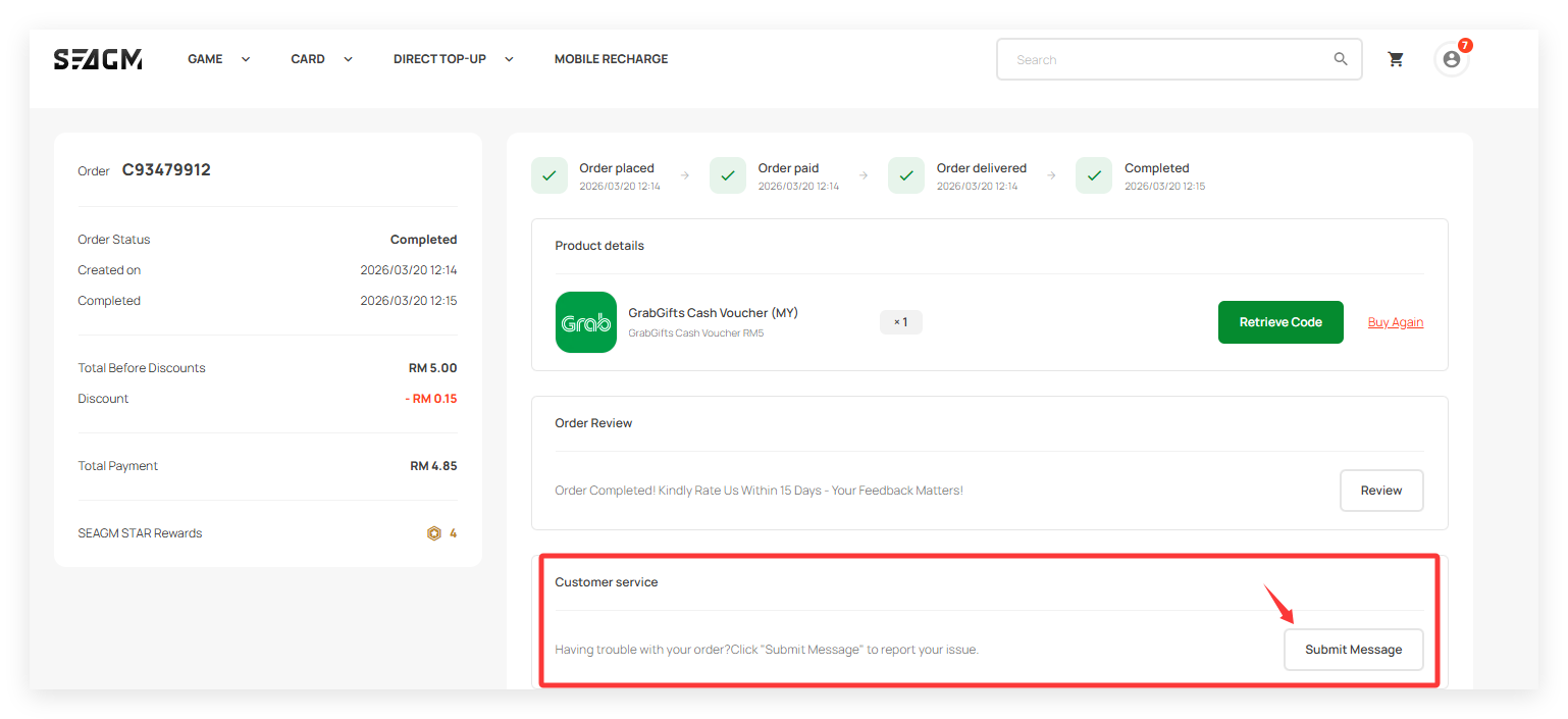 4. You will see a button labelled “Customer Service.” Click on Submit Message to proceed.