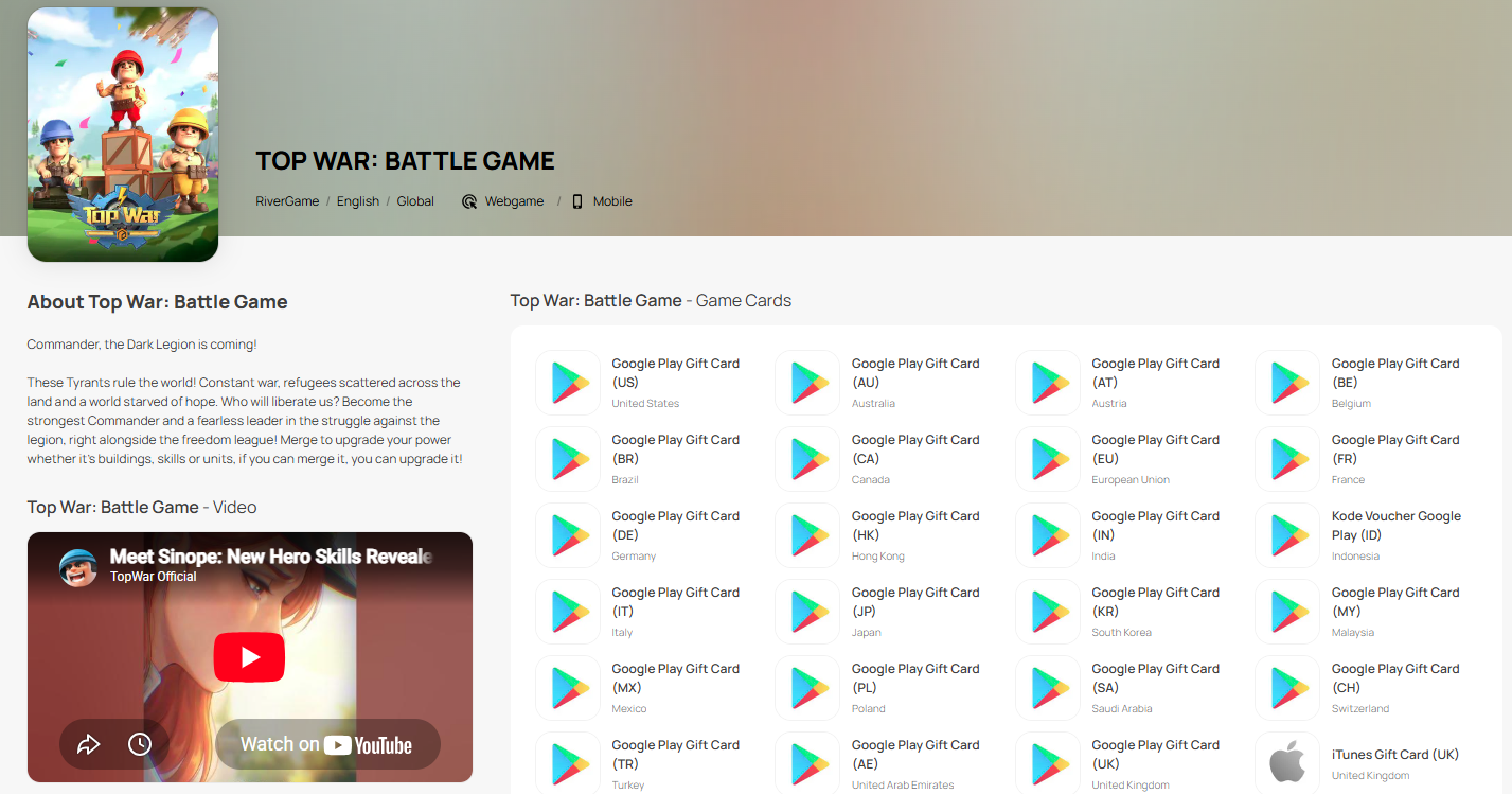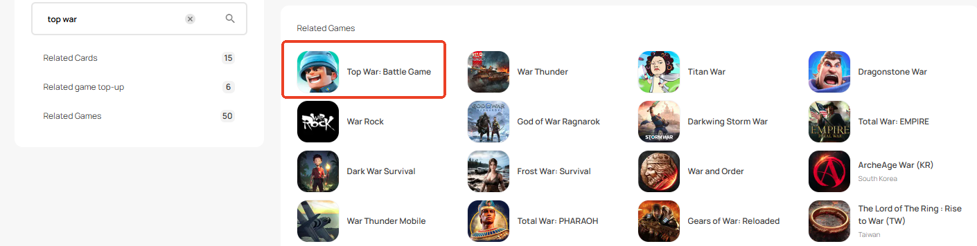 Step 1: Log in/register an account in SEAGM. On the top menu, enter the keywords "Top War" and search. Select "Top War: Battle Game".