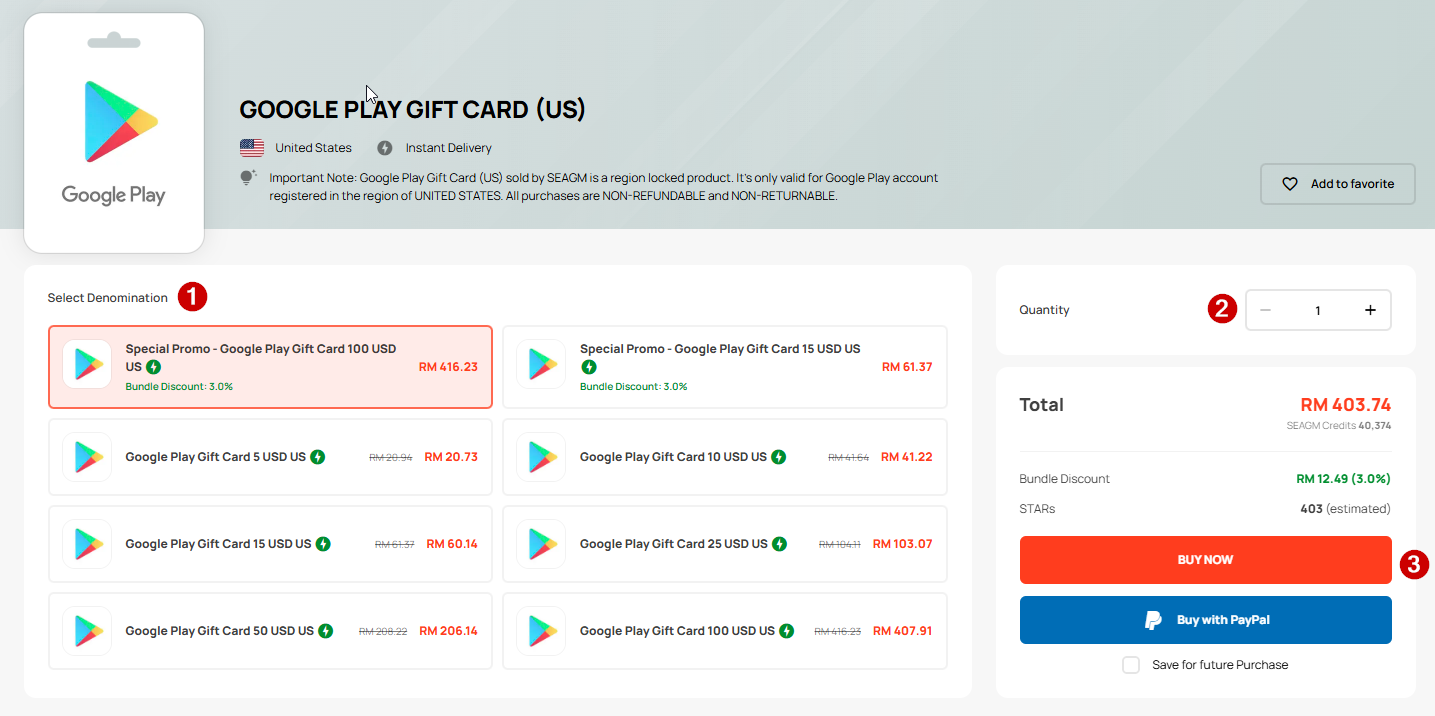 - The Google Play Gift Card sold in SEAGM was a region-currency-locked card. Please ensure the purchase gift card region is the same as your registered Google account.