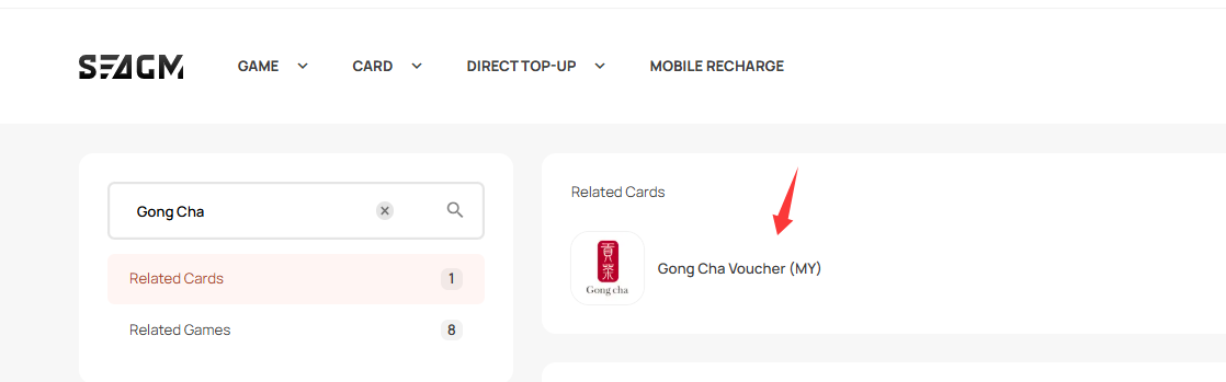 Step 1: Log in or register for an account in SEAGM. On the top menu, enter the keywords "Gong Cha" and search. Select "Gong Cha Voucher (MY)".
