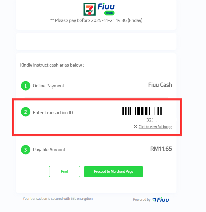Langkah 4: Sistem akan menjana Transaction ID, Verification Code, dan barcode. Anda boleh mengambil tangkapan skrin atau mencetaknya untuk ditunjukkan kepada staf 7-Eleven.