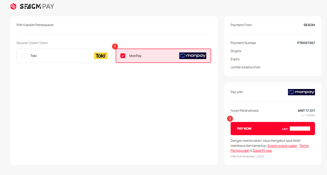 Langkah 2: Pada halaman Pembayaran, pilih 'Bayaran dalam talian' dan pilih pembayaran 'MonPay'. Kemudian, klik "Bayar Sekarang" untuk meneruskan.