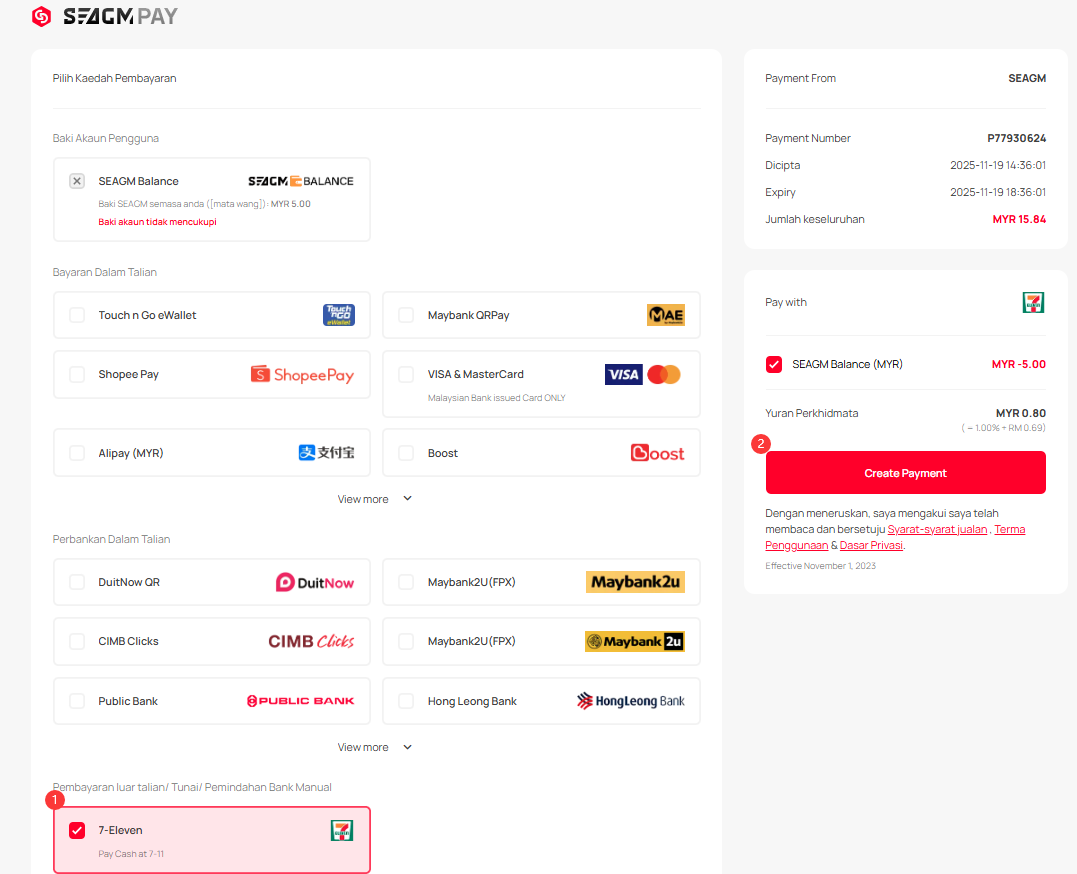 Langkah 3: Di halaman pembayaran, pilih Offline Payment, kemudian pilih “7-Eleven” sebagai kaedah pembayaran pilihan anda. Klik “Create Payment”.
