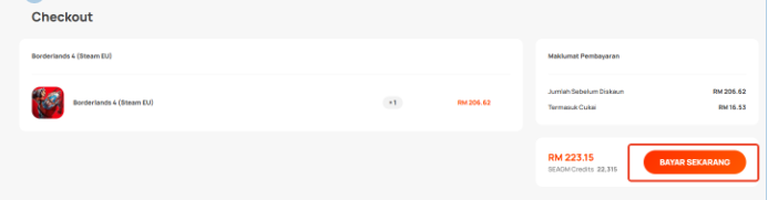 Langkah 1: Log masuk/daftar akaun dalam SEAGM. Pada menu atas, masukkan kata kunci "Borderlands" dan cari. Pilih "Borderlands 4 (Steam EU)".