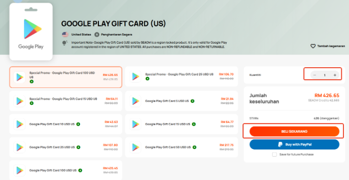 - Kad Hadiah Google Play yang dijual di SEAGM ialah kad dikunci mata wang wilayah. Sila pastikan kawasan kad hadiah pembelian adalah sama dengan akaun Google berdaftar anda.