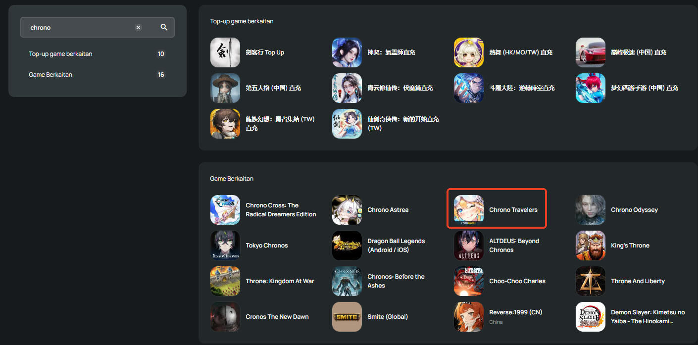 Langkah 1: Log masuk/daftar akaun dalam SEAGM. Pada menu atas, masukkan kata kunci "Chrono" dan cari. Pilih "Chrono Travelers".