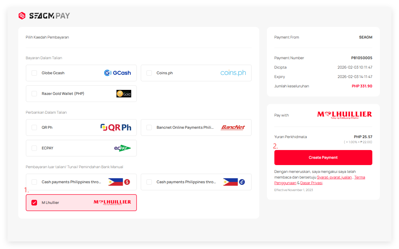 1. Kaedah pembayaran M Lhuillier [PHP] HANYA tersedia untuk pengguna Filipina di bawah peso Filipina [PHP] dalam SEAGM.