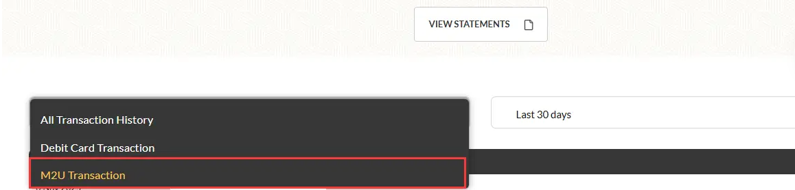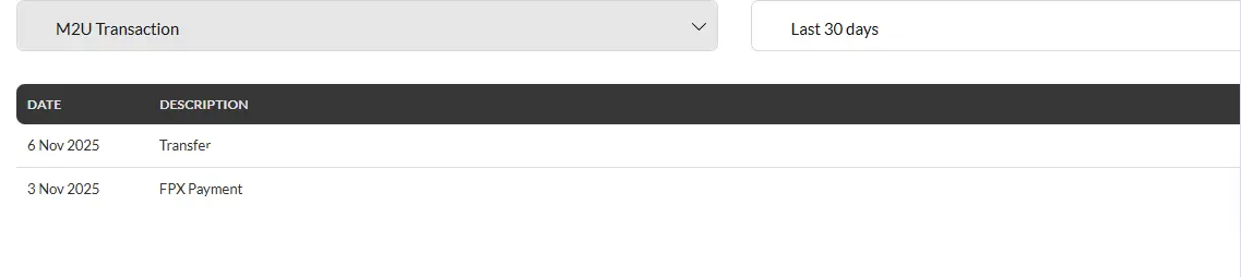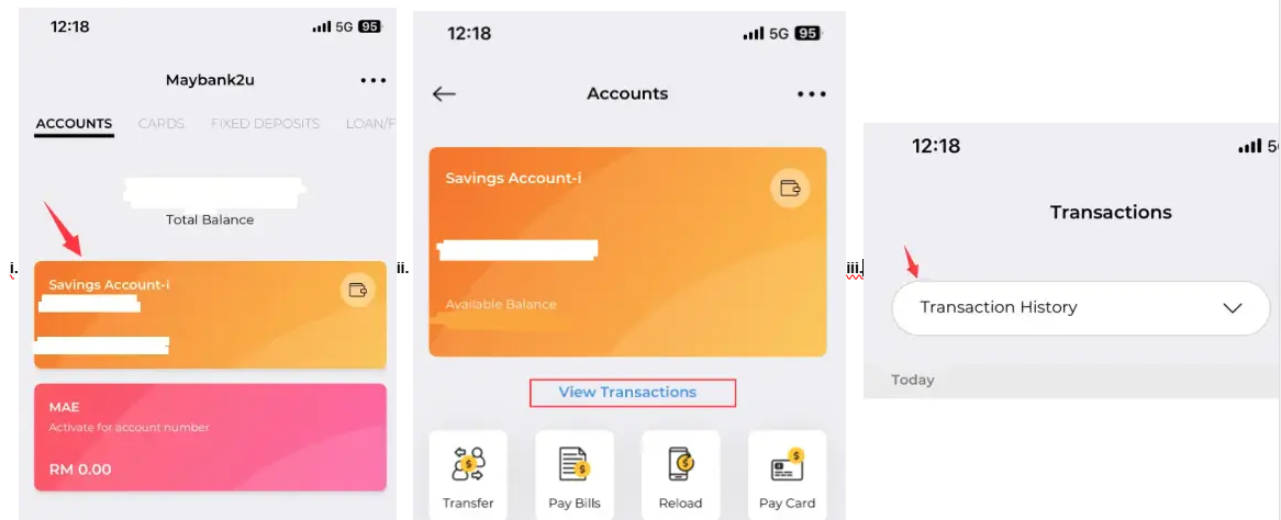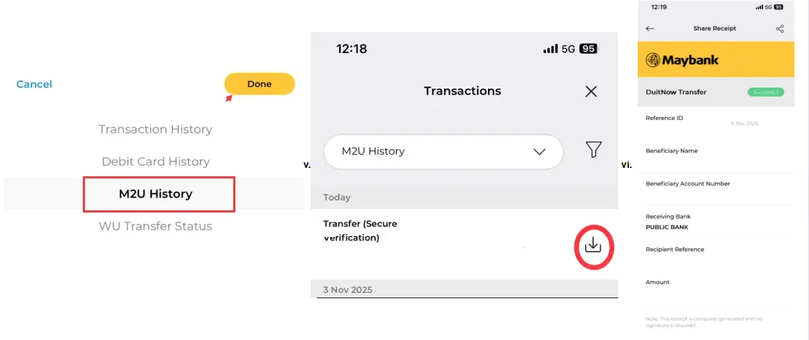 [ii] Aplikasi: Klik [akaun simpanan/semasa], kemudian skrol ke bawah, dan anda akan melihat [lihat transaksi]. Klik pada [lihat transaksi] dan pilih [sejarah m2u] untuk melihat transaksi anda. Ketik ikon muat turun di sebelah transaksi untuk mendapatkan resit anda.