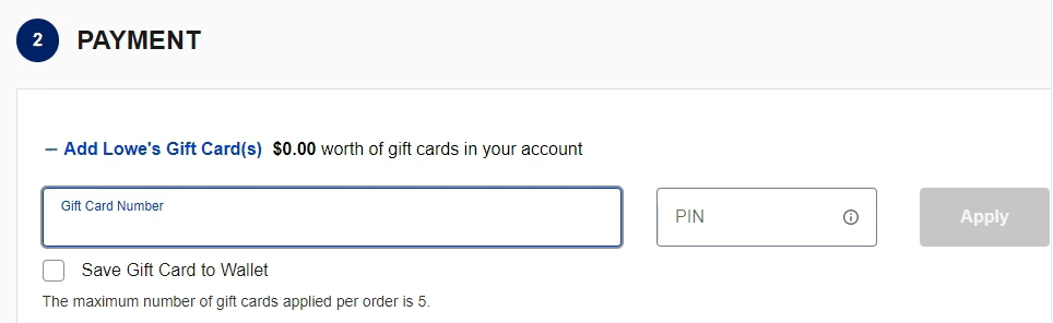 Langkah 4: Apabila bersedia untuk membeli, teruskan ke pembayaran dan pilih ‘Tambah Kad Hadiah Lowe’s’ di bahagian pembayaran.
