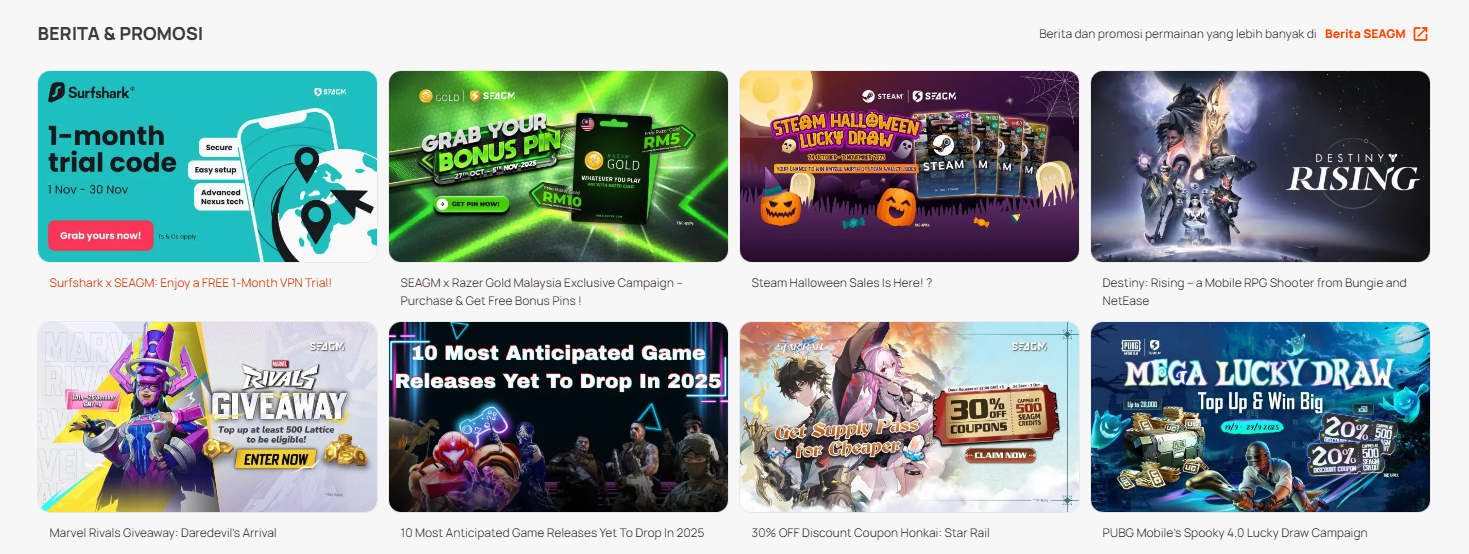 Langkah 3: Klik “Lebih banyak berita dan promosi permainan di Berita SEAGM” untuk dihalakan ke halaman Berita SEAGM, di mana anda boleh menemui semua acara, tawaran dan kemas kini terkini.