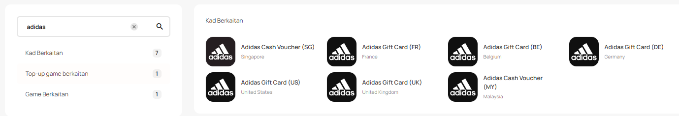 Langkah 1: Log masuk/daftar akaun dalam SEAGM. Pada menu atas, masukkan kata kunci "Adidas" dan cari. Pilih  "Adidas Cash Voucher [MY]".