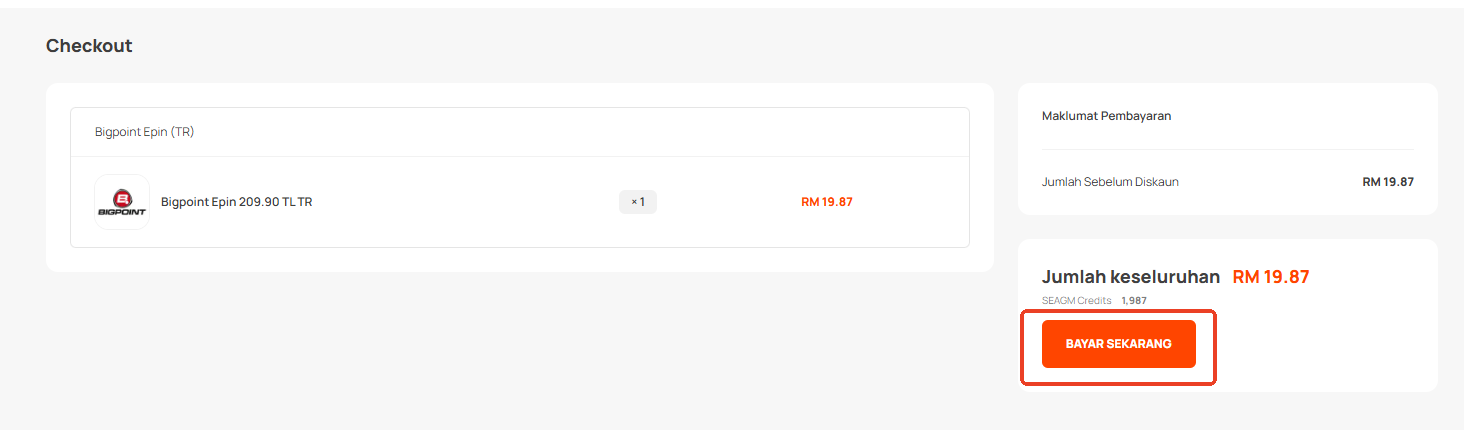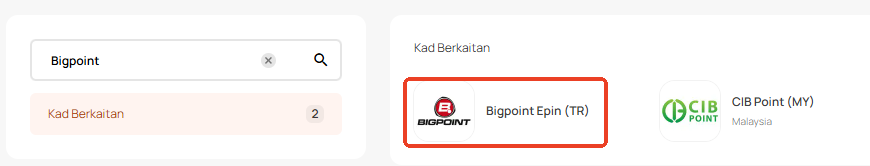 Langkah 1: Log masuk atau daftar untuk akaun dalam SEAGM. Pada menu atas, masukkan kata kunci "Bigpoint" dan cari. Pilih "Bigpoint Epin (TR)".